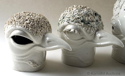 These four heads were part of the studio’s liquidation in 2019. They are all glazed and utilized the same bird head mold that is 10″ wide from back of head to beak tip. Height is between 6″ and 6.5″ depending on how the top of the head was decorated. These are quite heavy for their size, weighing 6 lbs each. Working from the same basic (poured) greenware mold, the finishing artist then modified each one via carving and/or applying additional decorations; see the post about how porcelain sculptures are created for a more detailed explanation of the process. The greenware piece is then put into the kiln for the bisque firing which produced the bird heads seen here. Because of the materials and process, these are considered to be porcelain rather than papka.
