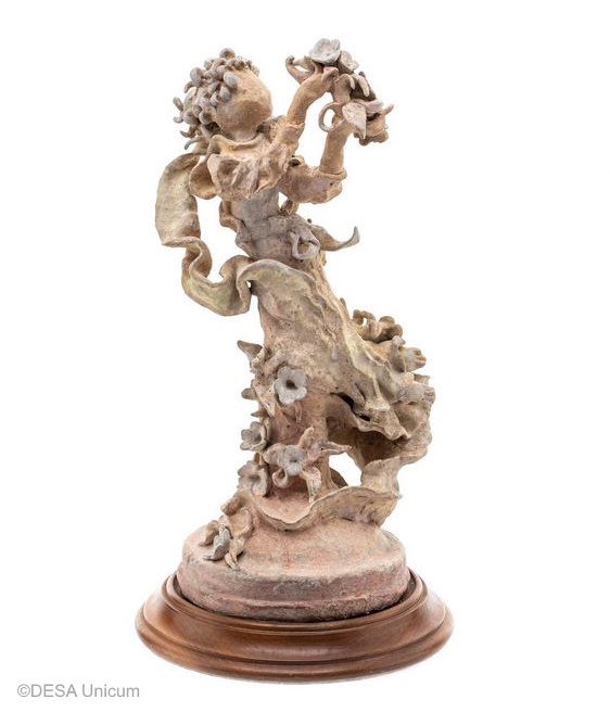 This Angel with Flowers was created between 1940 and 1942 and is about 12″ high. The extremely malleable nature of the wet clay formula is very obvious in the construction of this piece. It appears in the 1971 museum exhibit catalog Cybis in Retrospect. This same piece was sold in Philadelphia in 2019 as part of the studio’s liquidation auction, and subsequently made its way to Poland where it was sold again (2023) by an auction house in Warsaw. The color photos are from that 2023 sale.