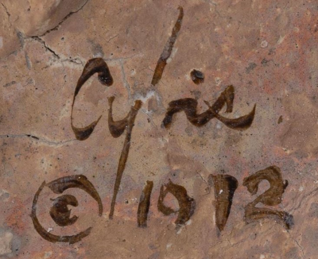Again we see the addition of a modern signature, a copyright symbol and the letters A.P. meaning artist’s proof (but only somtimes, as explained here.). No Cybis pieces made before the 1960s were originally signed in that way; the first piece that they copyrighted was in 1962. The designation A.P. is a misnomer in these cases; “prototype” or “sample” or “one of a kind” is far more accurate.