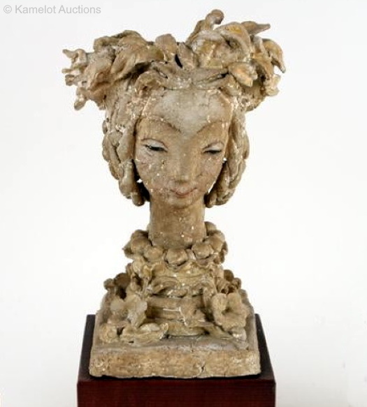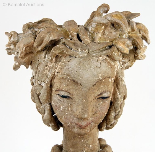 Another modern-marked piece is this one which I originally named “wood nymph bust with birds”. The auctioneer cited it as being 16″ high. This piece was sold twice during 2013: first in June in the USA in the same sale as the previous two, and then a mere five months later by a Polish auction house. This too had modern markings. Note the open eye sockets just like Bacchus and the Bearded Man. I am now more than 90% certain that this is the piece listed in Cybis in Retrospect as Woman With Birds, cited as a OOAK piece that was unglazed and in color and approximately the same size.
