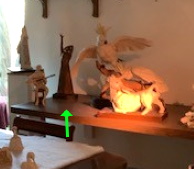 When the Cybis building was put up for sale in 2019, I spotted something unusual in one of the listing photos: a brown or bronze-colored version of the JFK Tribute piece, indicated by the green arrow. It’s possible that the color/finish on this may be the same as seen on the gold-washed Prophet but not as dark; they may have simply omitted the gold highlights on this, given the somber subject, or they simply may not show up even in this enlarged area of the photo at that distance. This piece was not included in the auction-house liquidation of most of the items left in the studio.