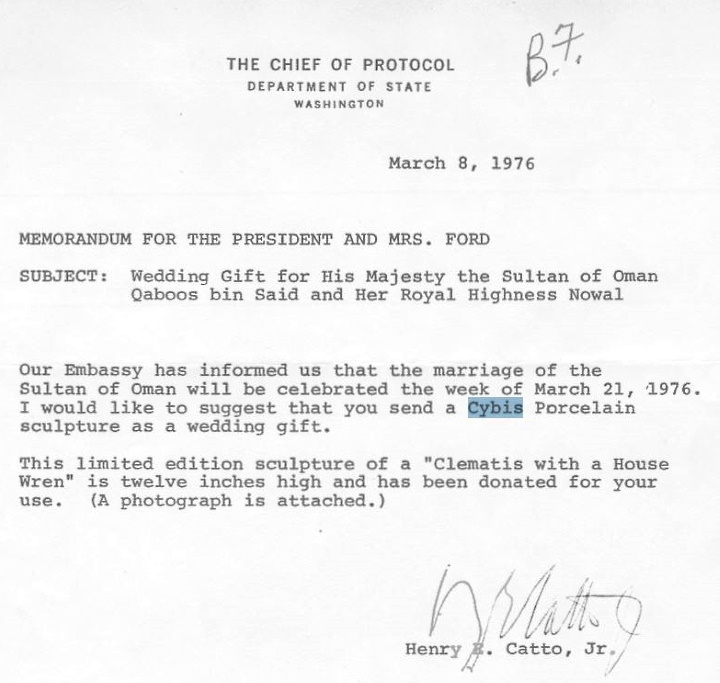 Gift Unit documents show that in December 1976, in connection with the marriage of the Crown Prince of Thailand, a “Wedding gift from President and Mrs. Ford should arrive by [diplomatic] pouch no later than Friday, December 17th. The gift is a Cybis limited edition porcelain sculpture entitled ‘Dogwood and Mountain Laurel’ in Presidential gift wrap, with the Presidential Seal and a gift card enclosed.” This is a very intriguing entry because there was no such named Cybis sculpture as Dogwood and Mountain Laurel. There were several open-edition dogwood subjects (most a variation of the Wood Wren with Dogwood) plus a late-1980s open edition called Mountain Laurel with Butterfly, but none fit this description. If “Dogwood and Mountain Laurel” was one of a kind, it’s a shame there is no photo of it.