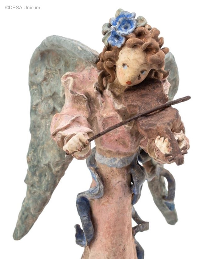 This hauntingly lovely Violinist (two views of a single piece) came up for auction at DESA Unicum in Poland in April 2024. Notice the differences between this example and the two previously shown. The most dramatic is that this angel is crying! This is not surprising, given that the Cybis’ homeland had been brutally invaded only a few months before. Another difference is the intensity of the blue paint on the flowers and ribbon as well as the dark pink of the angel’s gown. This example, too, is double-signed and is also dated 1940.