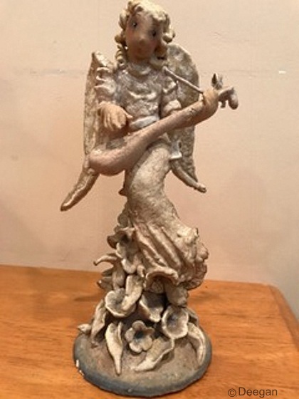 From a different source comes a photo of the Cellist and there will be additional photos of her added at a later date. Unlike the three foregoing examples, this one is in an unpainted state. The darker areas are probably due to age or dust accumulation over time; the porous nature of papka makes it impossible to ‘deep clean’ in the same way that fired porcelain allows. The angel’s right forearm is missing and the neck of the cello shows repair in three places below her hand. The piece of papka next to the angel is from a section of the leafy base adjacent to the bottom of the cello. Her feet are not visible in this photo but it is also possible, given the form and angle of her skirt, that she may be depicted in flight rather than standing; there are also no flowers in evidence but if this is a still-unfinished piece they may not have been applied yet. On the other hand, the base is pretty well filled with foliage and so it’s possible that the Cellist was not designed to have a floral decoration.