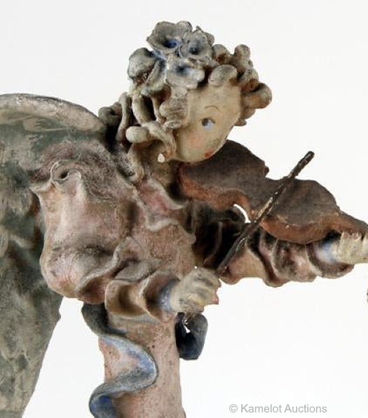 The Violinist angel wears a soft pink dress with a pattern of simple “flowers” in white paint. Two pink flowers decorate the sash at her waist and several more at the sculpture’s base. Her scarf, flowing behind her, has a more elaborate painted pattern. The soft texture of Cybis’ proprietary papka material allows for a great deal of freeform shaping and curves, as can be seen in the other 1940s examples in that medium.