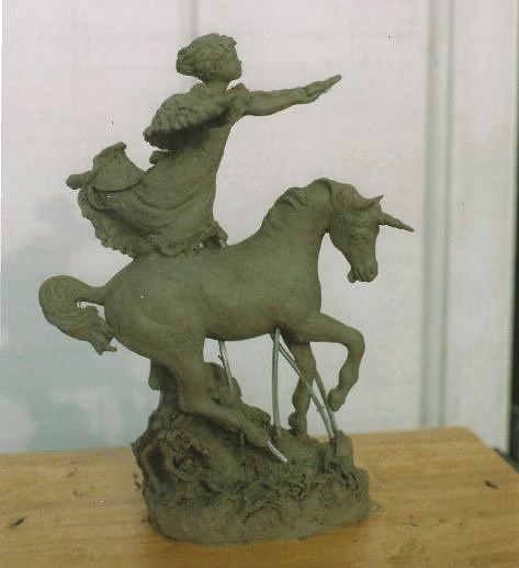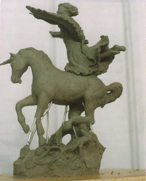 Angel on Unicorn has a special meaning, because it represents her granddaughter Ashley who perished in the 1993 fire, depicted here as an angel. This is the plasticine model; it is quite large and heavy, and was stored on a top shelf for many years. My huge thanks to Lynn’s friend Ron who took these photos in January 2024 and sent them to me!