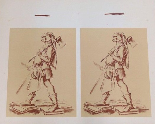 ..on the reverse side is also printed a two-color lithograph of a man who appears to be a woodcutter (because the object he carries in his right hand seems more like a tool than a weapon!)