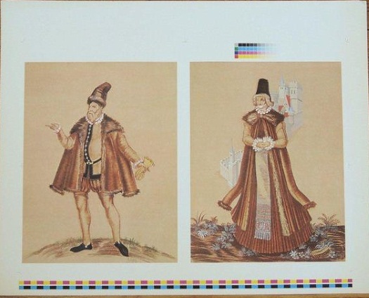 Comparing this list with the four images shown above, we can assign the name Peasant Woman with Baby to the first lithograph, but the other image on that sheet is trickier: Is he the Army Engineer, or the Merchant, or the Soldier? All are described as having a castle in the background. Here Google comes to our rescue with results for a Polish army uniforms search, pegging him as a 17th-century infantry officer: