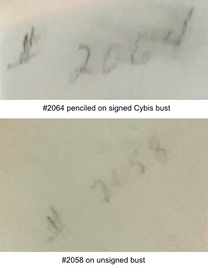 An examination of the undersides shows that both have Cybis design numbers: #2064 on the Cybis-signed smaller bust, and #2058 on the larger unsigned one.