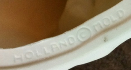 The mold/design itself was copyrighted and sold by Holland Mold Company from the 1950s probably through the 1970s at least. Examples sold at retail (to hobbyists) included the Holland name and copyright symbol as part of the bottom of the base mold. This design has multiple mold components and there were two versions that differed regarding the hands. In one version Mary’s hands are part of the body mold (arms) and in the other, they are actual separate mold pieces. Naturally when they sold these molds wholesale (to a ceramics company or studio) they would not have the Holland Mold impression on them. The studio/company/customer would add decorations to the resulting pieces in whatever way they chose.