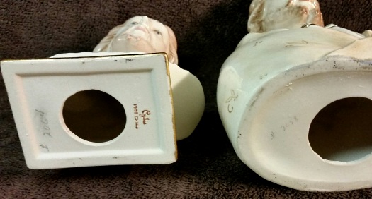 The bust on the right is 8.75″ high and was also from a commercial mold. This one is not signed Cybis but can be identified as one not only because of the similarity in decoration to signed pieces of the era, but also by the design numbers which appear on both of these.