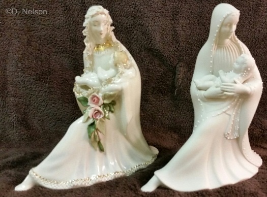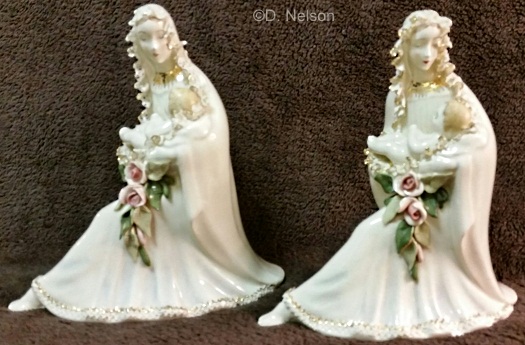 Now here’s an interesting pair! The figurine on the right (all white, with tiny white “beads” edging everything except the bottom hem) is from a mold bearing the Holland Mold imprint shown earlier. Mary’s hands are separate molds, and her bodice has a ‘pleated’ surface instead of being smooth. The hobbyist who made this example did a very nice job indeed. The example on the left, with the lace, gold trim, and roses, is actually an unsigned Cybis.