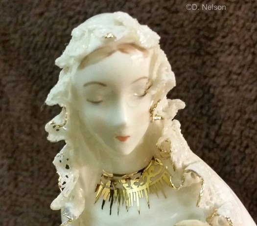 Here is another Cybis-signed example. No halo this time, but her veil edges are now trimmed in dipped lace with gold edges and she has acquired a spray of pink roses in her lap. The hem of her robe retains a thin line of gold.