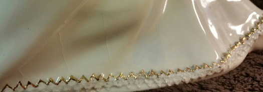 Here is the bottom hem, adorned with a narrow row of dipped lace having gold paint on the upper edge. Notice the crazing on this glazed piece, which is something hardly ever seen in Cybis pieces. This particular one was probably subjected to extremes of heat and/or cold while in storage somewhere.