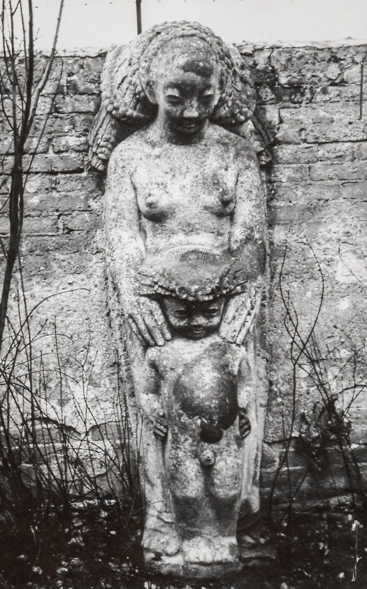 The ancient-Babylonian style of this female sculpture is heightened by the flat back section making the outline appear very geometric. Depending on how tall that garden wall was, this may have been a very large sculpture indeed!