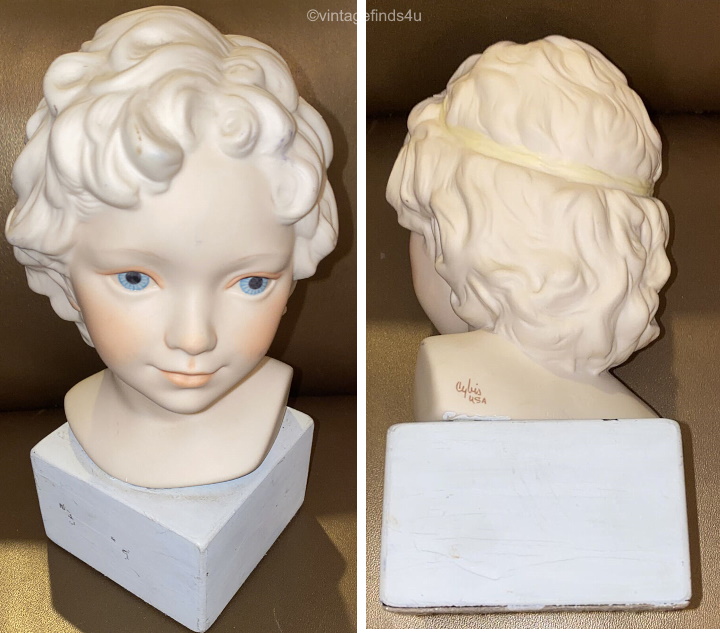 This Psyche is on a base that was not painted by Cybis. For some reason, an owner decided to paint her original black base this blueish-white color, and without even removing the bust; not only is the original bottom felt intact, but you can see brush marks on the bottom of the porcelain (second photo.) She is also missing the blue butterfly that was originally on her headband.