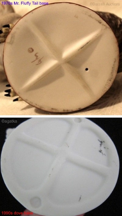 The other round base with the odd underside was used for the Dove in Flight, a 1990s “body snatch” from the 1987 Bridal Centerpiece which was glued to the top of it and, unlike Mr. Fluffy Tail, could not have worked on its own.