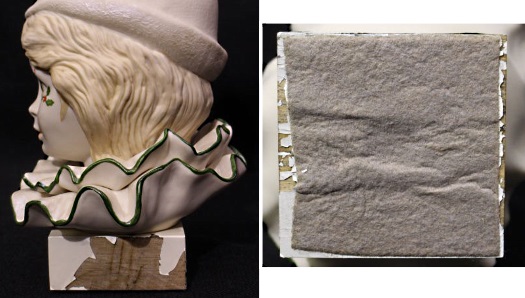This is what happens to a painted wood base if you expose it to water. You can see how the entire base was painted, even the underside, before the felt was glued on. The owner of this piece apparently didn’t want to risk separating bust from base, repainting the base, and reassembling…although it definitely could be done. Cybis obviously used a latex paint on these bases.