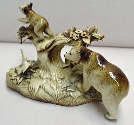 Cybis pieces produced during the 1950s are noticeably different from the post-1960 sculptures in several ways. One is that almost all of them were cast from commercially available molds, a topic more fully explored in When Is a Cybis Not a Cybis. Another is that a fair percentage of 1950s items were fully glazed, rather being bisque fired as all later sculptures are. And a third is the use of a paint technique that, according to later Cybis literature, was dubbed “Cypia.” (pronounced “SEE-pee-ah” and spelled as a play on the studio’s name)