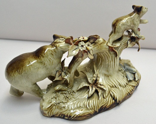 This Pieta, although much lighter in tone than any of these other pieces, still qualifies as Cypia in my estimation. The edges of the base are accented with gold paint rather than black which would have been much too dark next to the lighter grass/foliage. Perhaps by the time this was produced the studio had begun to shift away from the Cypia look? It’s also possible that flash photography or strong lighting has washed out much of the brown shading and made the piece look paler than it actually is.