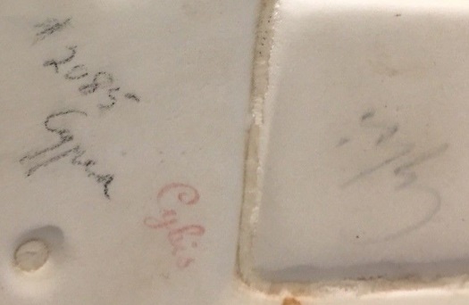 The underside of a similarly colored Saint Francis provides a banquet of informational marks. There is the often-seen 1950s Cybis name-stamp in red paint; there is the sometimes-retained mold/design code (2085 for this piece) in grease pencil; there is a faded hand-painted Cybis name (redundant and one would think unnecessary because the stamped one is already there); and most importantly, the word “Cypia” in grease pencil! So here is proof that a Cypia piece can indeed include other colors as well.