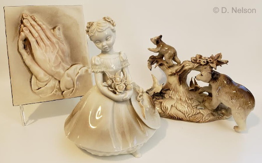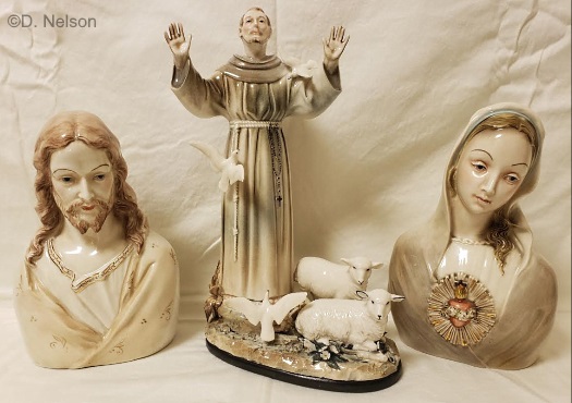 These three 1950s religious sculptures – a Jesus bust, Saint Francis with Doves and Lambs, and an Immaculate Heart of Mary bust – all qualify for membership in the “Cypia Club.” One could quibble that Saint Francis’ robe would be brown in any case, and that some of the leaves are dark green, but the overall effect is definitely sepia. Notice the black porcelain base section and keep it in mind. (Additional details about these three sculptures can be found in the Jesus Sculptures, Religious Studies, and Early Madonnas posts.)