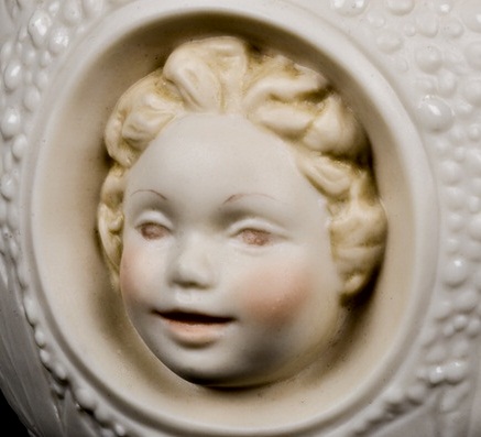 This adaptation of the Daisy Vase but with a lady’s face and crossed hands, was never released for retail; these are test pieces, so we may as well name this the Lady Face Vase. Notice the lily of the valley flowers added to the mold (compared to the Daisy Vase.) I would not be at all surprised if the artist who designed these two vases was the same person who designed the mid-1980s Annual Decorative Eggs. Just a hunch! [photos used by permission of the Museum of American Porcelain Art]