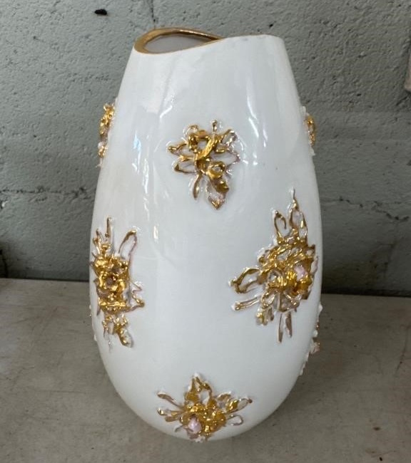 However, given the overall style, I would guess that this glazed white vase with gold paint splatter appliques is either from the late 1950s or early 1960s. It does look ‘1960s’ to me and so I am assigning it to that timeframe. I wouldn’t be surprised if it was on a 1960-1962 price list!