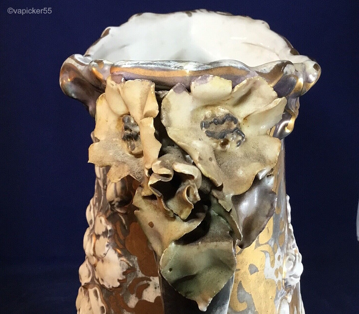 Here’s a really cute pair of miniature vases with rose handles — and I do mean ‘miniature’, because both are less than five inches high (4.5″ and 4.25″, respectively) and the opening is so narrow that one would be forgiven for thinking that perhaps they were intended as holders for very slim candles! The froth of blowsy roses and swirls of gold decoration are pure Cordey-esque, although the numbers (if representing design/mold) do not match either Cordey or Cybis because the 1xx series was not used. At least these are conveniently marked with the year they were made… 1945. The muted purple color is both unusual and attractive.