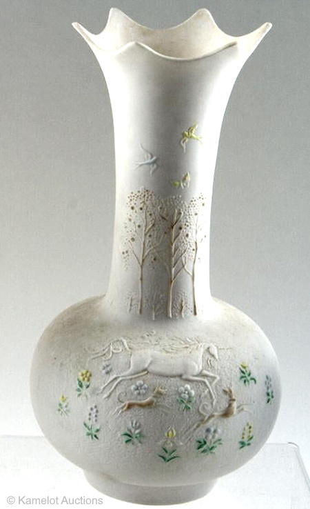This Iris Vase also had a matching pair of candlesticks and a dish, both shown in the Giftware post. It is 10” high, appeared in 1984 and was retired before 1988. Price history is unknown. It is likely that this was also available in plain white bisque although I have not yet found a photo of one. I am in the process of investigating whether these other iris-motif vases were also designed by George Ivers.