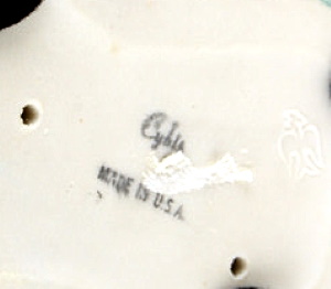 To make things even more confusing, the old stamp and a not-seen-yet-on-any-1950s-piece Made in U.S.A. paint-stamp appears on a Ruffles and Truffles which was part of the studio liquidation. It also is hand-marked as an artist proof (A.P) in either black paint or marker. The Made in U.S.A. stamp had previously been used only as a mold impression on 1980s pieces but here it has been used as a paint stamp instead.