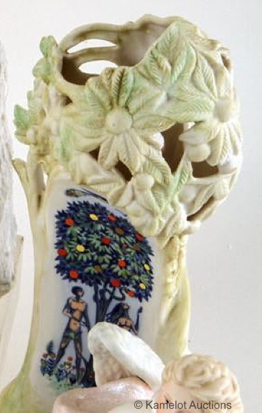 I suppose the simplest title for this is Adam and Eve on Tree. This is the shortest of the four and is probably 10” high, give or take a fraction, but is the most complex ‘body piece’ in terms of workmanship. It’s too bad that the auction house only showed one angle of each item, and that some items were partially obscured by others.