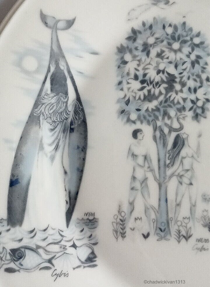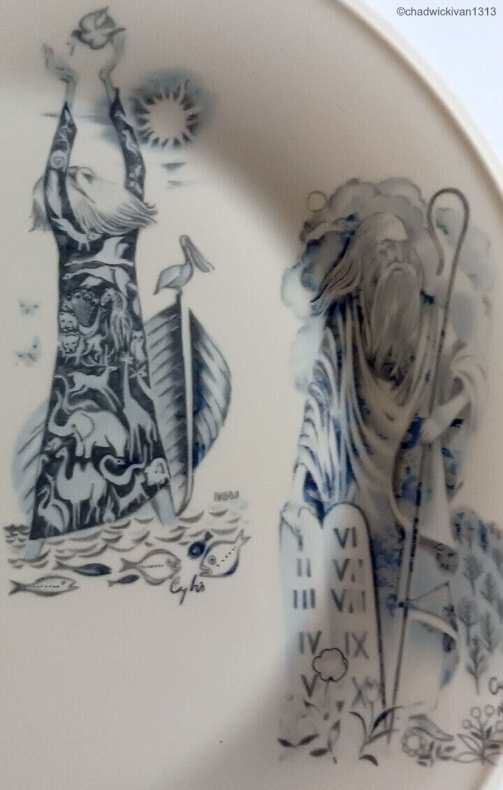 The designs appear (from the photographs) to have been applied as decals rather than hand-painted. This raises the possibility that this plate could have been the sample or test piece for a small or moderate sized retail run; why bother paying for having four decals created for only one single plate? The question then becomes, if a retail run was (or was to have been) produced, who would be the manufacturer: Cybis, or Lenox? Unlike Boehm, Cybis is never known to have produced any decorate plate of this type (standard plain blank, with no relief work or hand painting) although there were some from Lenox. However, Google searches for lenox plate ivers, lenox plate noah, lenox plate moses, lenox plate adam eve, lenox plate bible, and lenox plate biblical produced no matches. This makes it more likely that the plate shown here was a sample or a one-off.