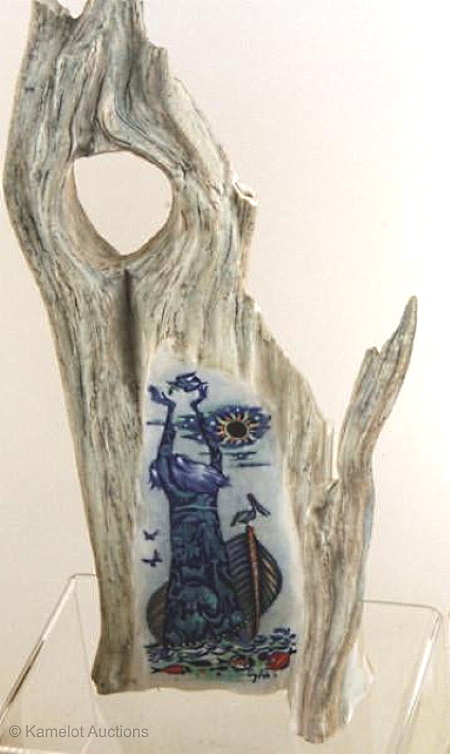 Jonah on Wave is quite dramatic with the whale looming up behind him! In this design Ivers’ signature appears just above the top of the small waves on the right-hand side. I would guess this piece to be about 12” high because it is slightly shorter than the Noah one.