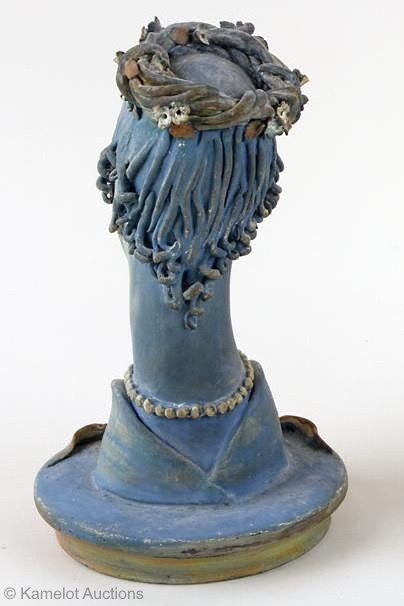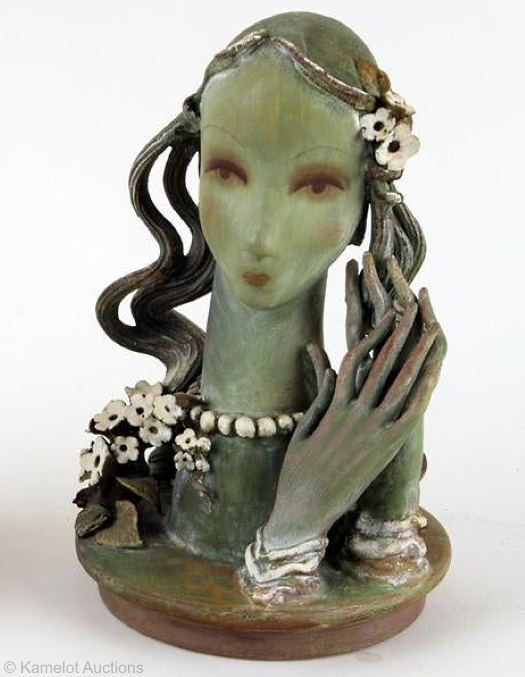 My guess is that this long-haired green lady bust was made at essentially the same time as the blue lady bust with pearl necklace. The difference here is that the head mold is tilted in the other direction, i.e., toward her left instead of her right. The hands follow suit, being placed on the other side so that in both cases her head is tilted toward her hands. The painting style is the same in both instances; only the color is different. It uses the same long-curls mold but one of them is positioned slightly more to the front on this sculpture.