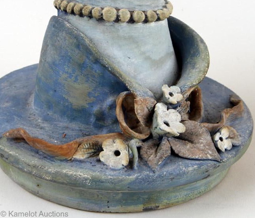 This blue lady bust with a pearl necklace is a good place to start. The head mold has an elongated neck and is tilted slightly toward her right. Distinguishing facial features are heavy-lidded eyes and a full-rosebud shaped mouth. The base mold incorporates a ‘collar’ that also hides the attachment point of neck to base. Although it may appear as though the necklace is recessed into the neck portion, close examination of the photos show that they sit atop it; the shadows between the ‘pearls’ are provided by darker paint. This bust received a blue paint wash and no glaze. All of the applied decorations are either papka or a papka/porcelain blend that was easily molded into various shapes by hand.
