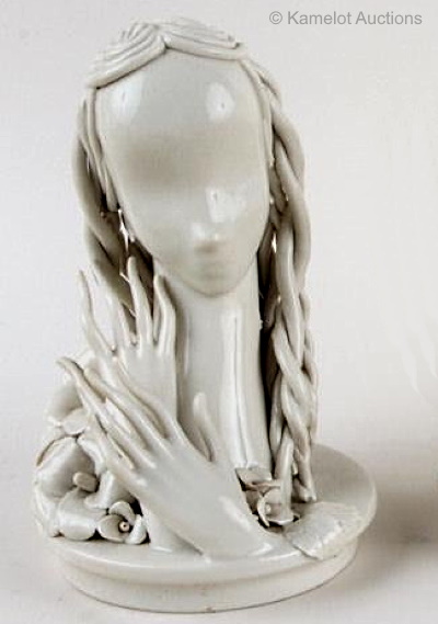 This wavy-haired sepia lady bust is the simplest of this version, with hands plus long hair waves added. Notice that the applied “back” hair is gone, replaced by a simple pigtails-type part and no curls or flowers, and that the waves have been cast from a mold rather than made freehand. Even the collar is minimalist and there are relatively few flowers. The flowers and leaves have moved away from the early modeling-clay look and have been formed from porcelain. Although fairly plain, this bust does not look rustic or primitive. (It is, however, shockingy dirty as were many of the pieces in the liquidation sale.) The paint color may well be the earliest example of what the 1950s studio would call their ‘Cypia’ tonation.