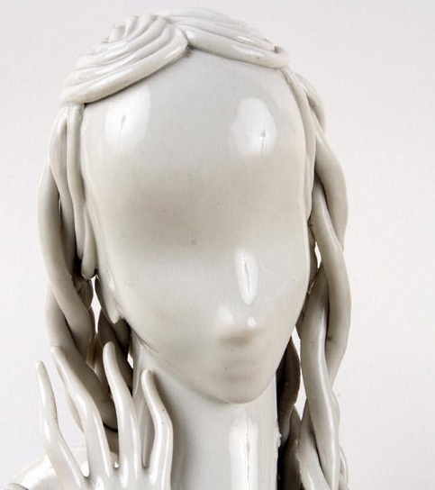 A variation on the minimalist theme is this highly glazed white bust with long braids. I suspect that the normal detail of the head mold was deliberately smoothed out in order to highly the contrast of the featureless face and hands with the intricacy of the hand-formed braided hair. The oversized, yet plain, flowers are about midway between those two extremes.