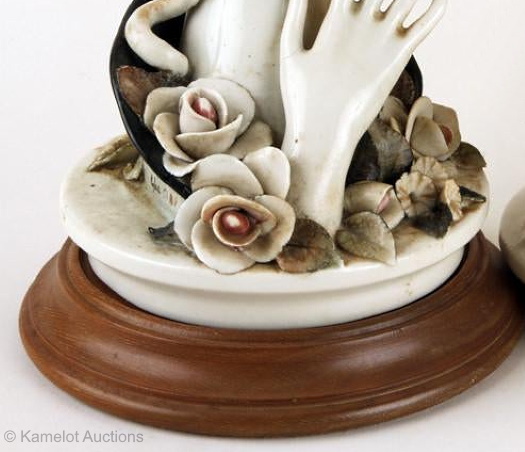 Stepping back to the more conventional designs of this bust, this bust with short curls and roses is probably one of the later ones produced. The cluster of curls at her ears give her an almost ‘Princess Leia’ look! The large roses decorating the base and, especially, the two-tone anemone flowers in her hair point to a late-1940s/early 1950s level of workmanship. This is a quite sophisticated lady bust indeed.