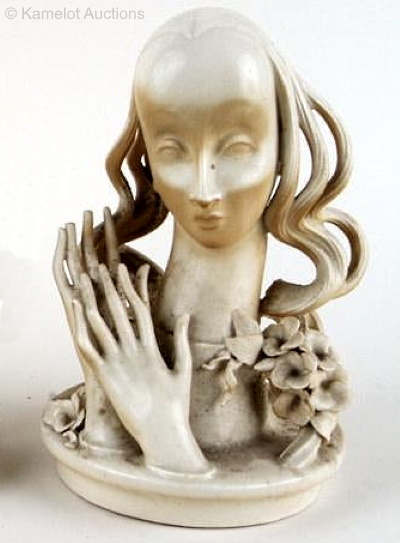 Here’s a glazed and slightly more frou-frou version of the same bust, titled (and misspelled) Geneiveve on her base. Without the necklace to visually break it, the long ‘swan’ neck is very noticeable. This iteration has a definite ‘Cordey style bust’ look which the glazed finish reinforces. The collar section of the base is higher and shaped in a more feminine manner.