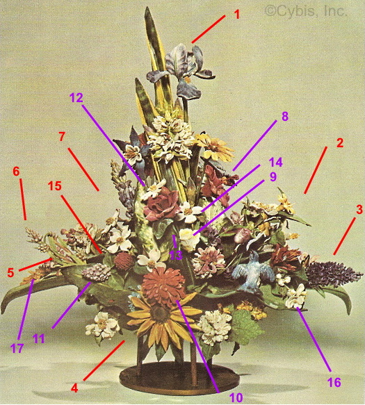 It is amazing (and embarassing!) that it took me so long to see the discrepancies between the two “official” Cybis photos of this piece. The color photo either does not show it in its original, as-finished condition … or there was more than one of these bouquets made. If so, that would flatly contradict the studio’s public claim of the Bouquet being one of a kind.