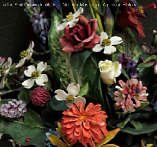 This is the Flower Bouquet of the United States currently in the holdings of the Smithsonian’s Museum. Notice that the wood supporting stand has been (thankfully!) changed from what appears in the circa-1970s photographs. Other than that one difference, the floral elements do match, in appearance and position, those seen in the Cybis 1979 catalog color photo. [Photos courtesy of the National Museum of American History.]