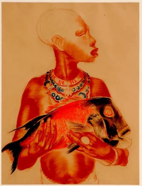 African woman with fish, mixed media on paper, 22” x 17” and described as unsigned. Not dated but likely 1930.