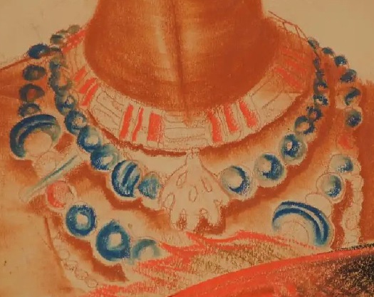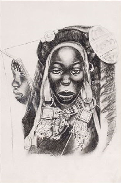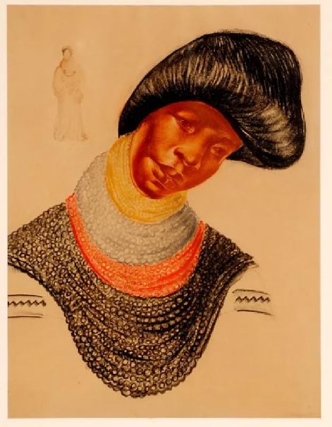 Black Seminole Woman, mixed media on paper, 22” x 17”, described as circa 1939. In February 2024, I became aware that my original identification of this as an African woman was incorrect. The Black Seminole community (also known as Black Maroon and Seminole Maroon) did not originate as a Native American tribe but were runaway slaves from South Carolina and Georgia during the 18th century. That particular group of slaves are known as the Gullah, and were descended from slaves who previously lived on the rice-growing regions of West Africa in the Niger delta. The Gullah, and the Black Seminoles, retained much of their African culture and even have their own language which is known as Gullah Geechee. It is the only distinctly African creole language in the USA. The unique characteristics of the Black Seminole community explains why their facial features and dress are different from the native Seminole and other Native American tribe members.