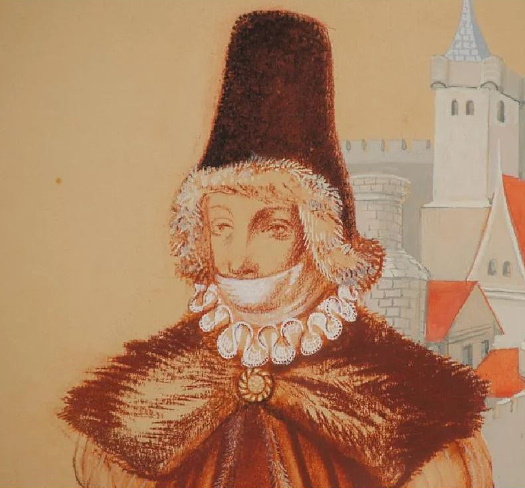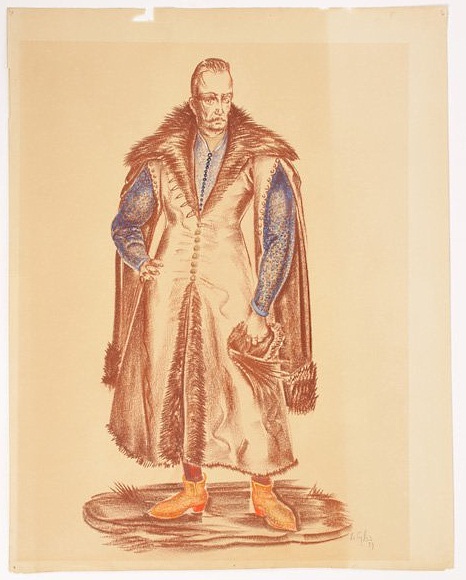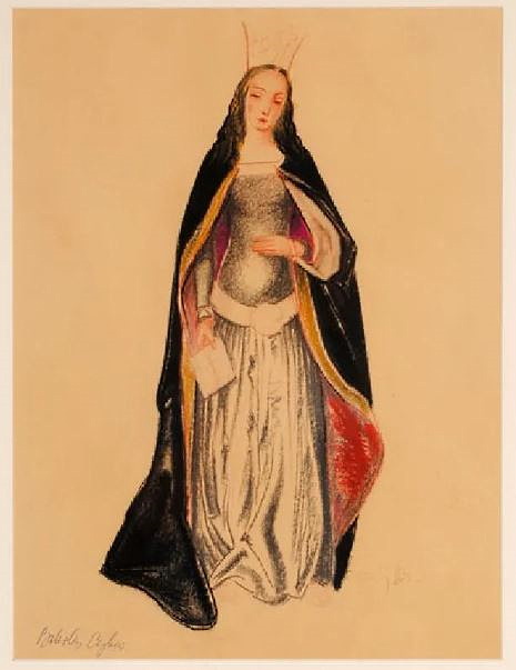 With this mixed-media drawing we step into a bit of a quagmire because it is among those that the modern studio (possibly during the early 1970s) reproduced as lithographs. When offered by Kamelot in June 2019, they titled it as “Elizabethan Royalty” which is ridiculous; Boleslaw Cybis never drew portraits of Britons of the Tudor period, which is what “Elizabethan” means. These are Polish costumes. Because it’s difficult to tell whether this is a man or woman, let’s just title this drawing ‘Polish aristocrat.’ Image size is 22.5” x 17” and it has a typical B Cybis signature in pencil over a rock in the lower right corner. (For comparison, the size of the reproduction lithograph is only 15.5” x 12”.)