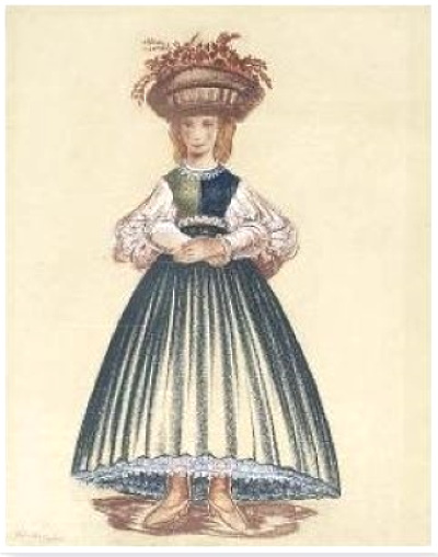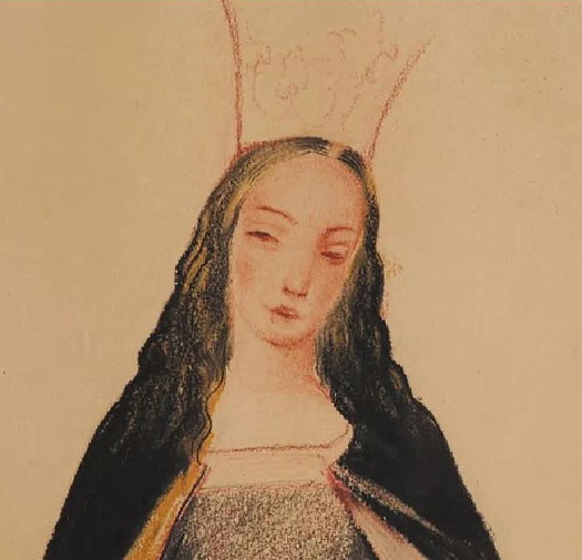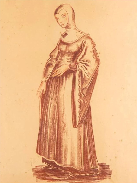 The title of ‘Townswoman’ is derived from a handwritten notation on the back of the drawing: “Mieszczanka” – Polish historical dresses – city girl – 16 of” which suggests that this may be the sixteenth drawing in a series portraying medieval Polish citizens in various styles of clothing. It is sanguine (red) crayon on paper, measures 12” x 15” and is signed B Cybis 1930. It is not known who made the notes on the back. This was originally sold by Kamelot Auctions, Philadelphia, in March 2020 in an inexpensive frame that had water damage to the cardboard backing.