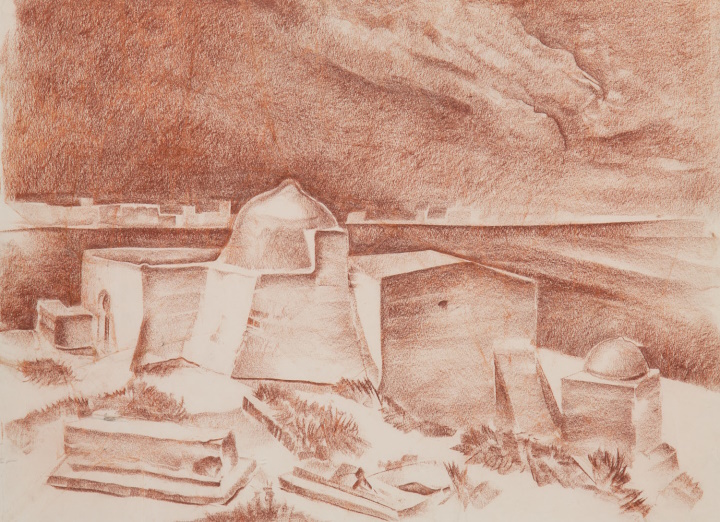 Eastern Landscape with Arab Buildings, sanguine on paper, approx. 15” x 20”, ca. 1930