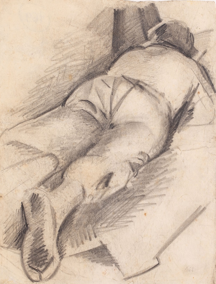 A pencil sketch of a man lying on his stomach, circa 1932-1937, measuring approximately 9″ x 6″.