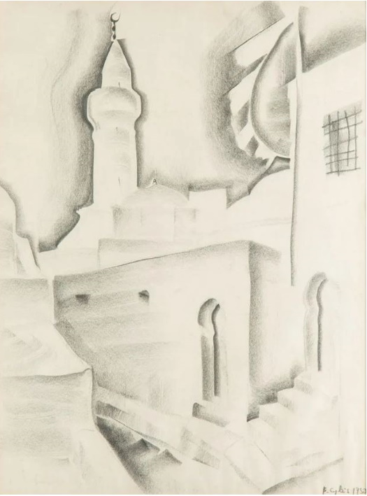 Mosque, crayon on paper, 19” x 14” signed and dated lower right B. Cybis 1930