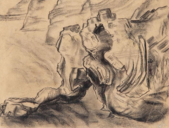 View of a rocky bay (‘Rocky Coast’) circa 1930. Carbon pencil, approx. 9” x 12”.